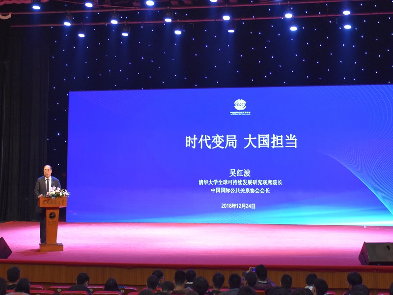 主旨演讲环节,首先由吴红波大使带来《时代变局,大国担当》主题演讲。吴红波大使清晰地分析了当代国际环境,阐述了中国在全球治理中经济、政治等多方面的贡献;详细介绍了联合国组织设置、经费管理等内容,呼吁在场学生培养参与全球治理的能力,有朝一日能够成为处理国际事务的专业人才,勇担青年之责,投身祖国建设。接下来上台演讲的是吕廷杰教授,演讲主题为《改变自己——成长的力量》。吕教授讲述了改革开放四十年来全球技术变革,以及改革背景下银行、邮政等行业的变化,通过生动的故事总结马云等企业家成功秘诀——改变自己。吕教授指出,在时代与周围环境的变化下,改变是前行不可或缺的力量。之后由周永生教授带来《从自己的人生经历中看待如何培养国际视野》的演讲,周教授风趣地讲述了自己中学时代的经历,感召年轻人树立高远目标,以康熙、彼得一世等中外伟人的对比,阐述学习先进经验的重要意义。最后潘建新教授为大家带来《我与公共关系》的主旨演讲。潘建新教授以幽默的语言、渊博的学识生动形象地介绍了公共关系的相关知识,逐渐将现场气氛推向高潮。