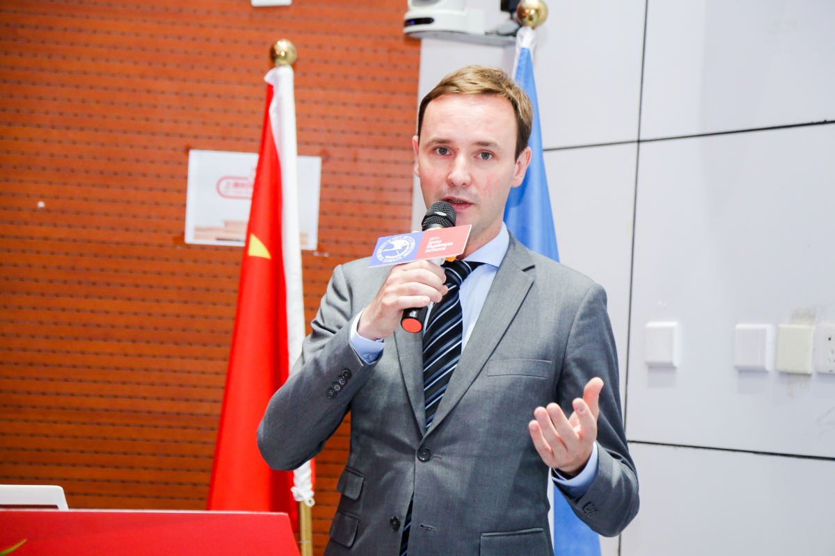 中国法国工商会北京区总经理Morgan LEFEVRE 发言,他向大家简单介绍了里昂商学院的历史起源以及中国法国工商会的建立、宗旨及其服务范围,作为中国法国工商会代理,他希望通过各种服务帮助法国公司在中国顺利开展业务,加强中法两国之间的合作关系,增进双方友谊。Morgan LEFEVRE先生坚信,选择北邮-里昂商学院EMBA是大家光明未来的一步。