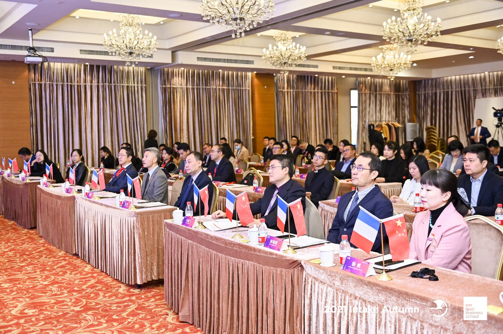 法国里昂商学院副校长、亚洲校区校长王华教授,法国里昂商学院EMBA项目主任张伟伟、EMBA项目助理主任王晶,冰球突破mg正规官网国际合作与交流处副处长杜悦,冰球突破mg正规官网党委书记胡启镔,执行院长王欢,党委副书记宋娟,副院长何瑛,副院长马晓飞,副院长张晓航,EMBA中心主任杨帆等领导嘉宾及2021级秋季班全体同学共同出席本次开学典礼。典礼由冰球突破mg正规官网副院长马晓飞主持。