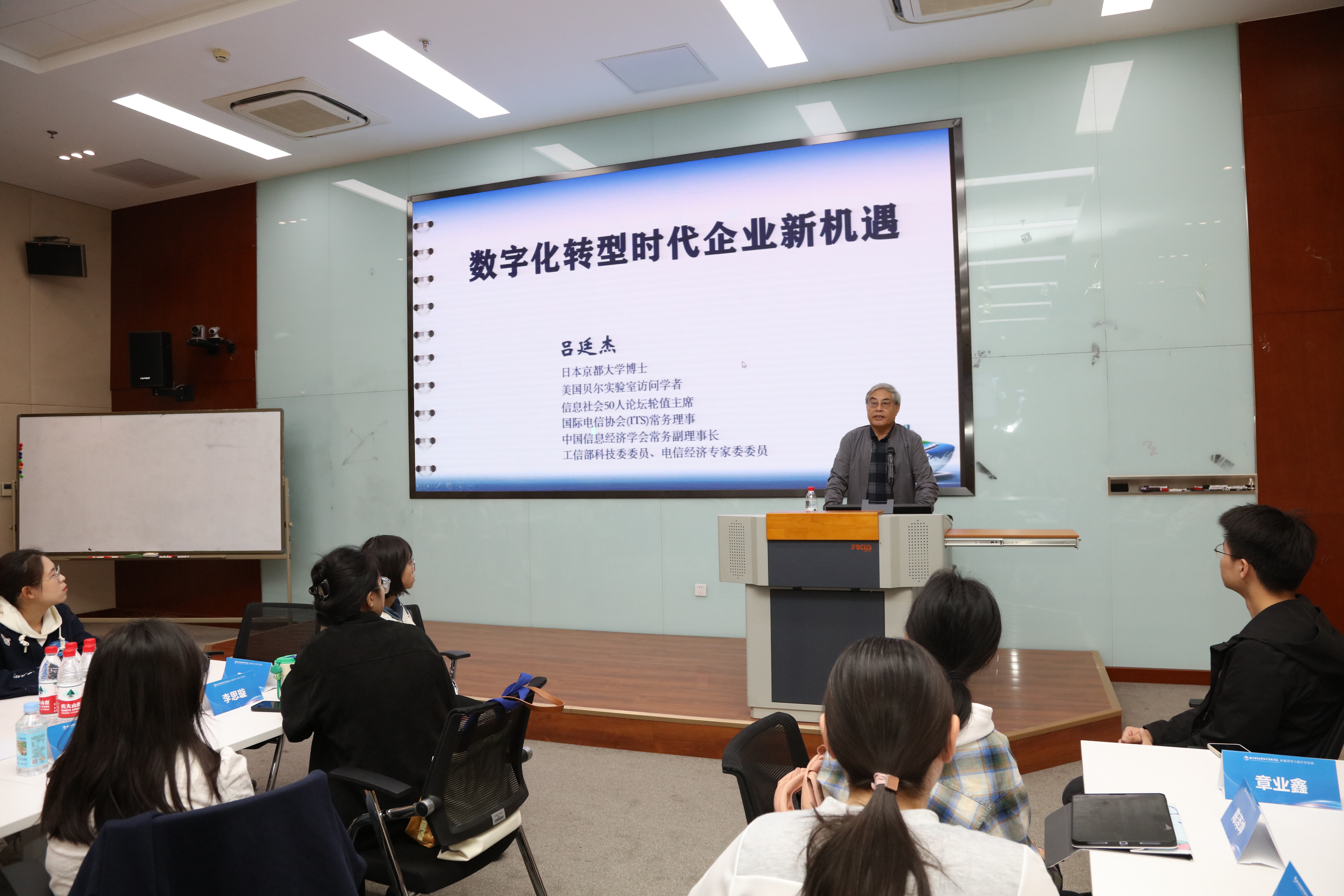 开班仪式结束后,卓越领导力实验班第一次课程正式开始。本期讲座由冰球突破mg正规官网教授、博导,国际电信协会常务理事,中国信息经济学会常务副理事长,冰球突破mg正规官网前院长吕廷杰教授主讲,以“数字化转型时代企业新机遇”为主题进行分享,讲授数字经济持续发展的产业趋势与核心动能及如何应对数字经济带来的挑战等问题。吕教授幽默诙谐,会场气氛活跃,整场讲座旁征博引、深入浅出、观点鲜明、内容丰富,结束后同学们仍意犹未尽。