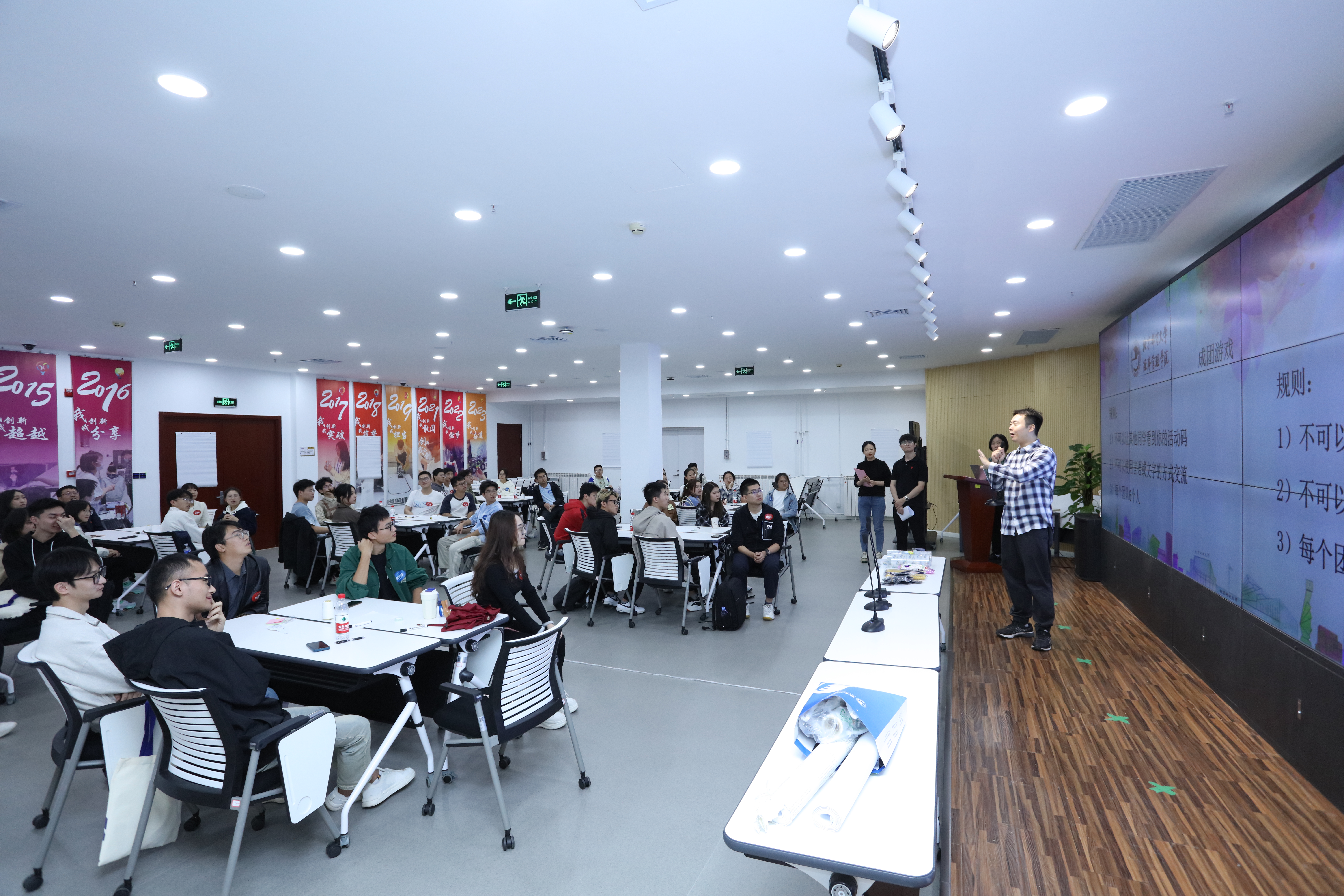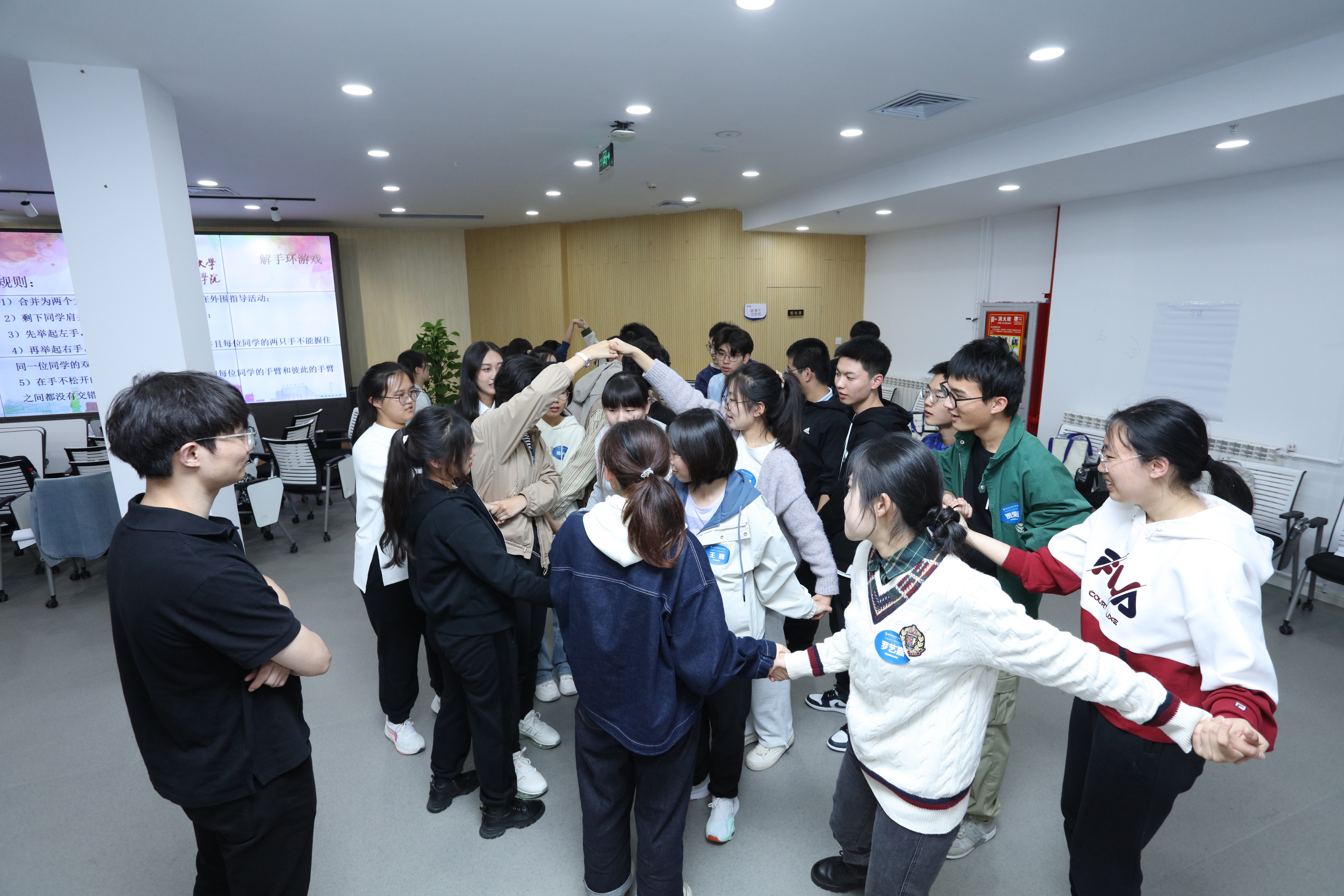 随后,冰球突破mg正规官网教师王砚羽、楚啸原、万滢霖及魏泽群继续带领同学们进行了破冰活动。通过团队项目游戏,各位分工协作、密切配合,圆满完成了各项挑战,增强了参与意识,达到了突破自我、凝心聚力、点燃学习的目的。