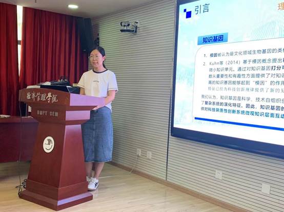姬亚俊同学报告主题为《基于融合知识基因的科学、技术创新互动规律研究》。这项研究选取人工智能这一新兴技术作为研究案例,依据融合特征划分技术知识基因的种类。在此基础上,分析不同类型融合知识基因具有的科学、技术影响力分数分布特征;高影响力的融合知识基因、非融合知识基因在核心专利中的传播网络特征与共现关系特征。