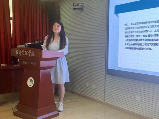 高琦芳同学报告主题为《数字化能力如何驱动非数字原生企业实现数字产品创新?——基于资源行动和机会集整合视角的案例研究》。这项研究立足资源行动和机会集的整合视角,深入某空间设计上市公司的数字产品创新实践,探讨数字化能力驱动数字产品创新的实现机制、演化机理和逻辑。
