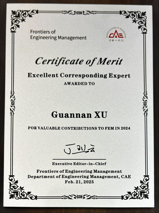 近日,在中国工程院院刊《Frontiers of Engineering Management》(FEM)特约通讯专家2024年度工作会议上,冰球突破mg正规官网许冠南教授荣获“2024年度优秀特约通讯专家”称号,并获主编丁烈云院士亲自颁奖。这一荣誉不仅是对许冠南教授为期刊建设所作贡献的高度认可,也彰显了冰球官网在工程科技管理领域的学术影响力。