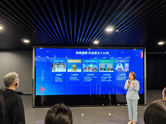 在沉浸式光影长廊的时空穿梭中,讲解员以四十年创新征程为叙事轴线,深度解读联想从中国科技产业拓荒者到全球智能变革引领者的进化密码:从艰苦创业的筚路蓝缕,到PC时代的品牌崛起;从全球化布局的纵横捭阖,到多元化转型的破局创新,每个战略决策都精准踩中时代脉搏。当历史时针指向第五个十年,联想已锚定"AI变革时期"新坐标,以AI原生战略为创新引擎,开启智能新纪元,全力构建覆盖"----"的全要素智能生态体系,为高质量发展注入澎湃动能,以智能驱动未来。
