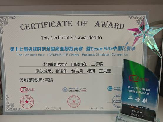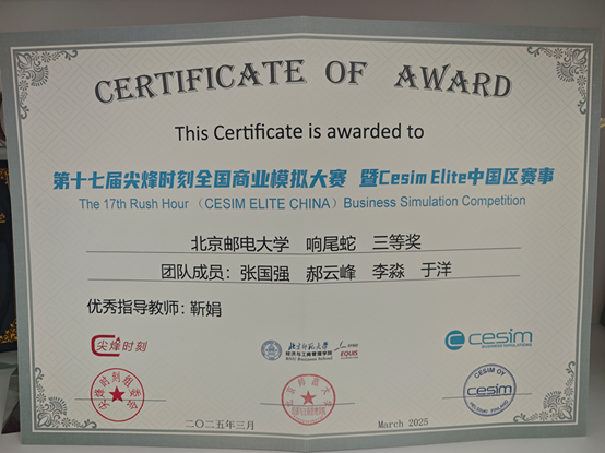 2025年3月28日至30日,由芬兰Cesim公司主办、北京师范大学承办的第十七届“尖烽时刻”全国商业模拟大赛总决赛在北京师范大学落下帷幕。冰球官网MBA 学子张泽华、黄吉月、王文慧、祁珂四人组建的“自邮自在”队,在靳娟老师的指导下,凭借出色的商业决策能力和团队协作精神,从全国2000余支队伍中脱颖而出,斩获全国二等奖。