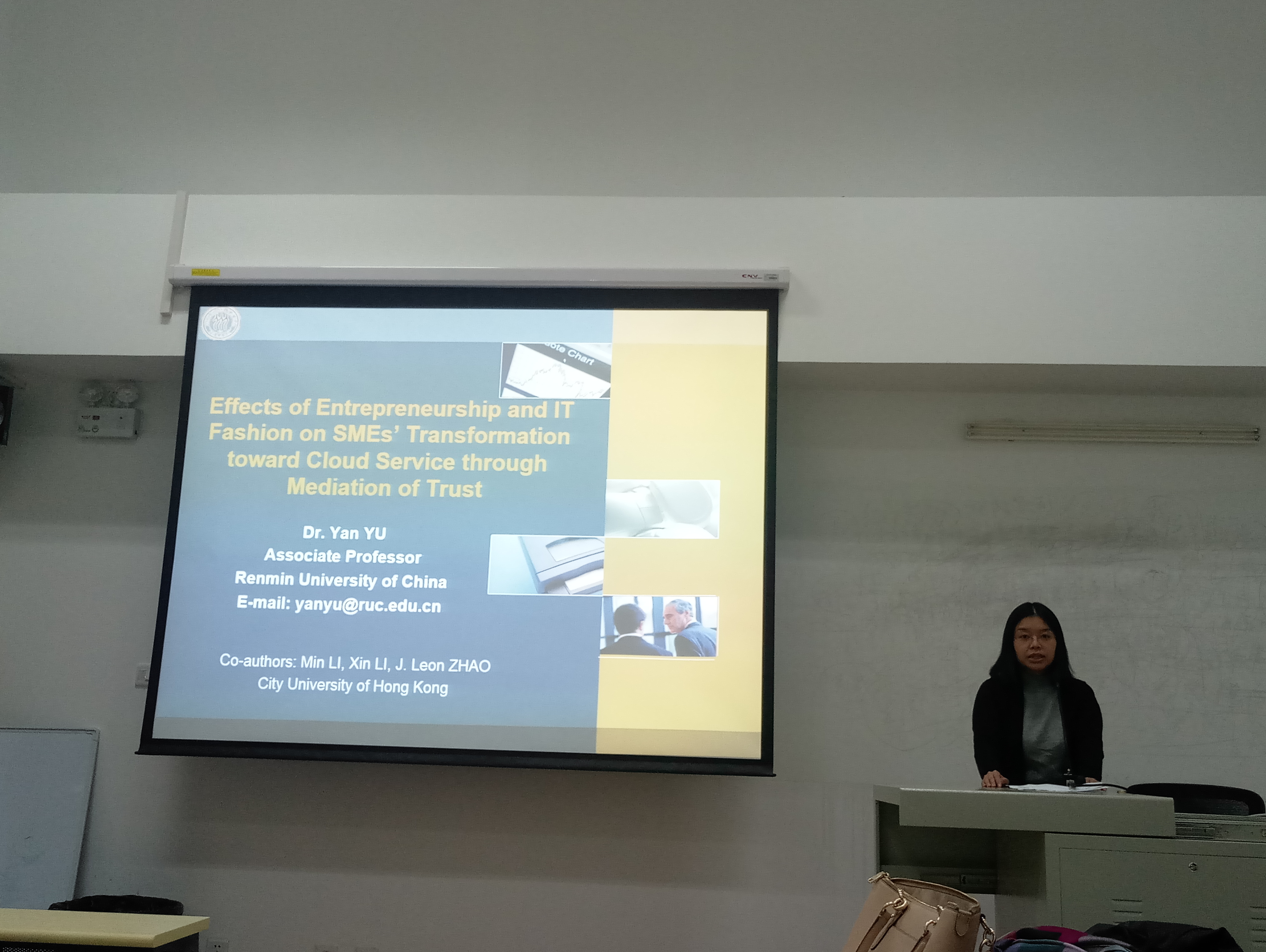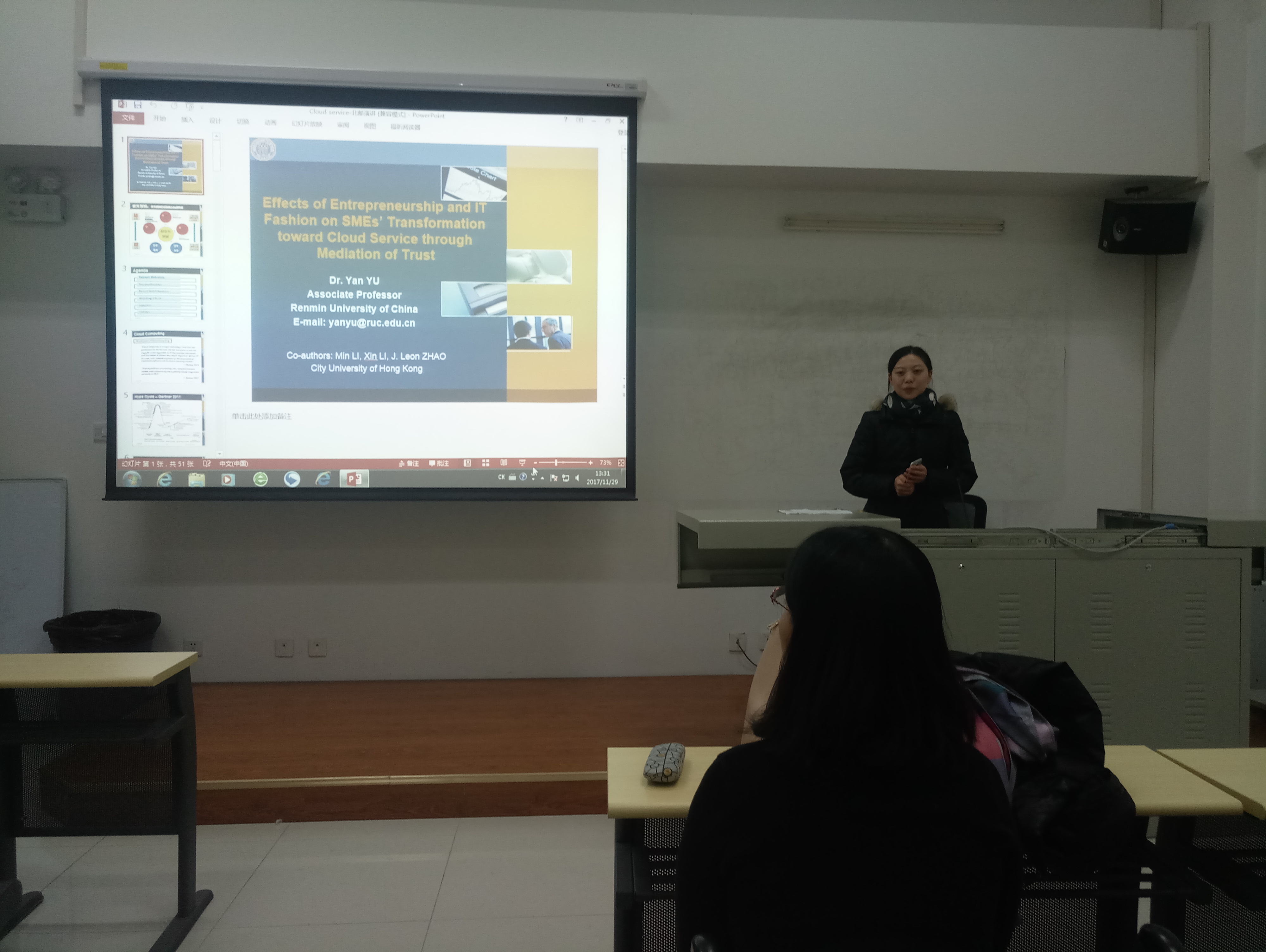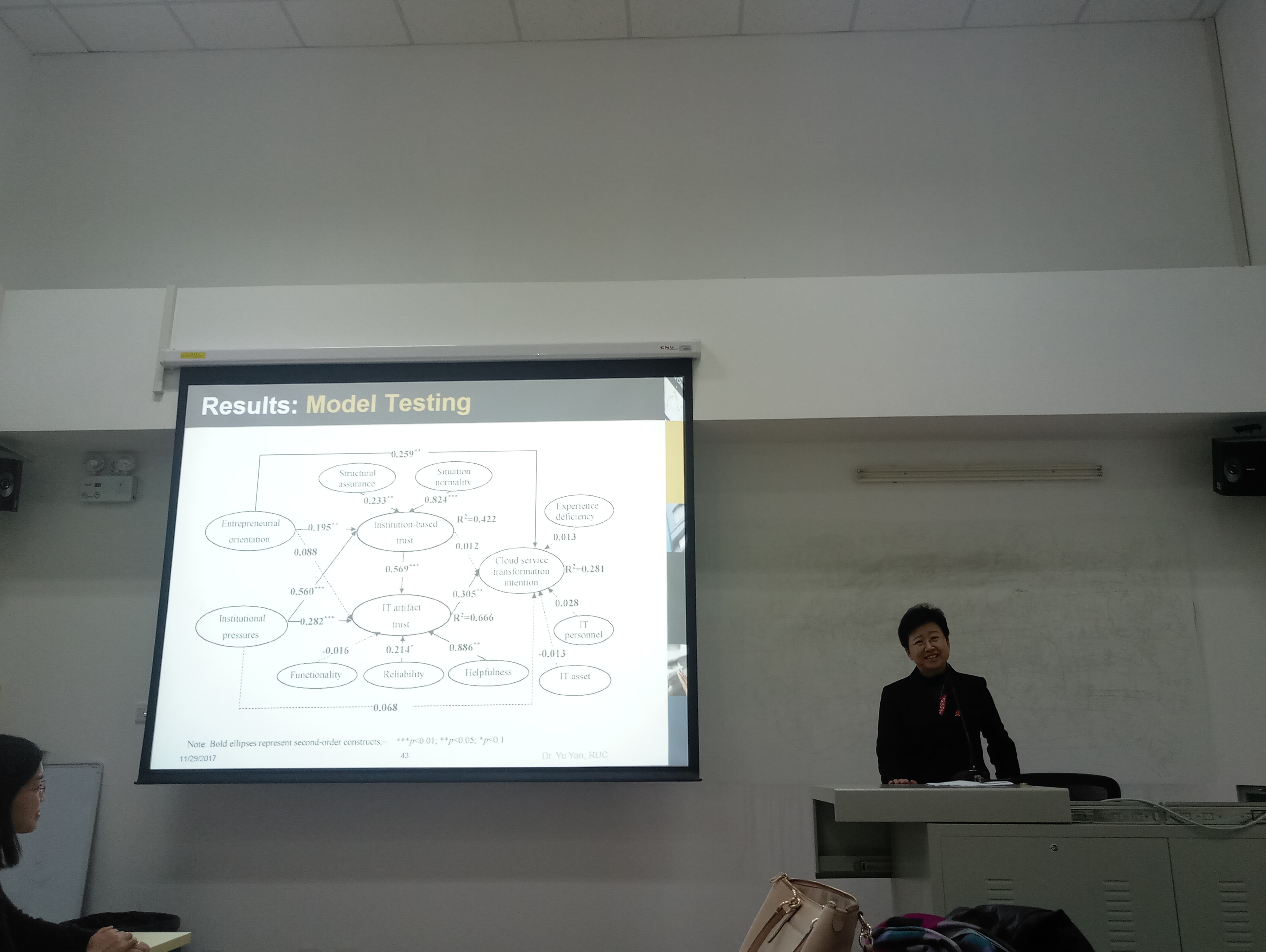2017年11月29日,冰球突破mg正规官网在经管楼225开启了第十一期青年学者学术论坛。会议邀请了中国人民大学信息学院副教授余艳老师分享其最新研究成果。余艳老师以其2017年在国际期刊(information & Management)上发表的文章为例,向听众们详细介绍了论文选题动机、研究视角选择、研究模型设定、再到投稿和修改中遇到的问题和处理经验。