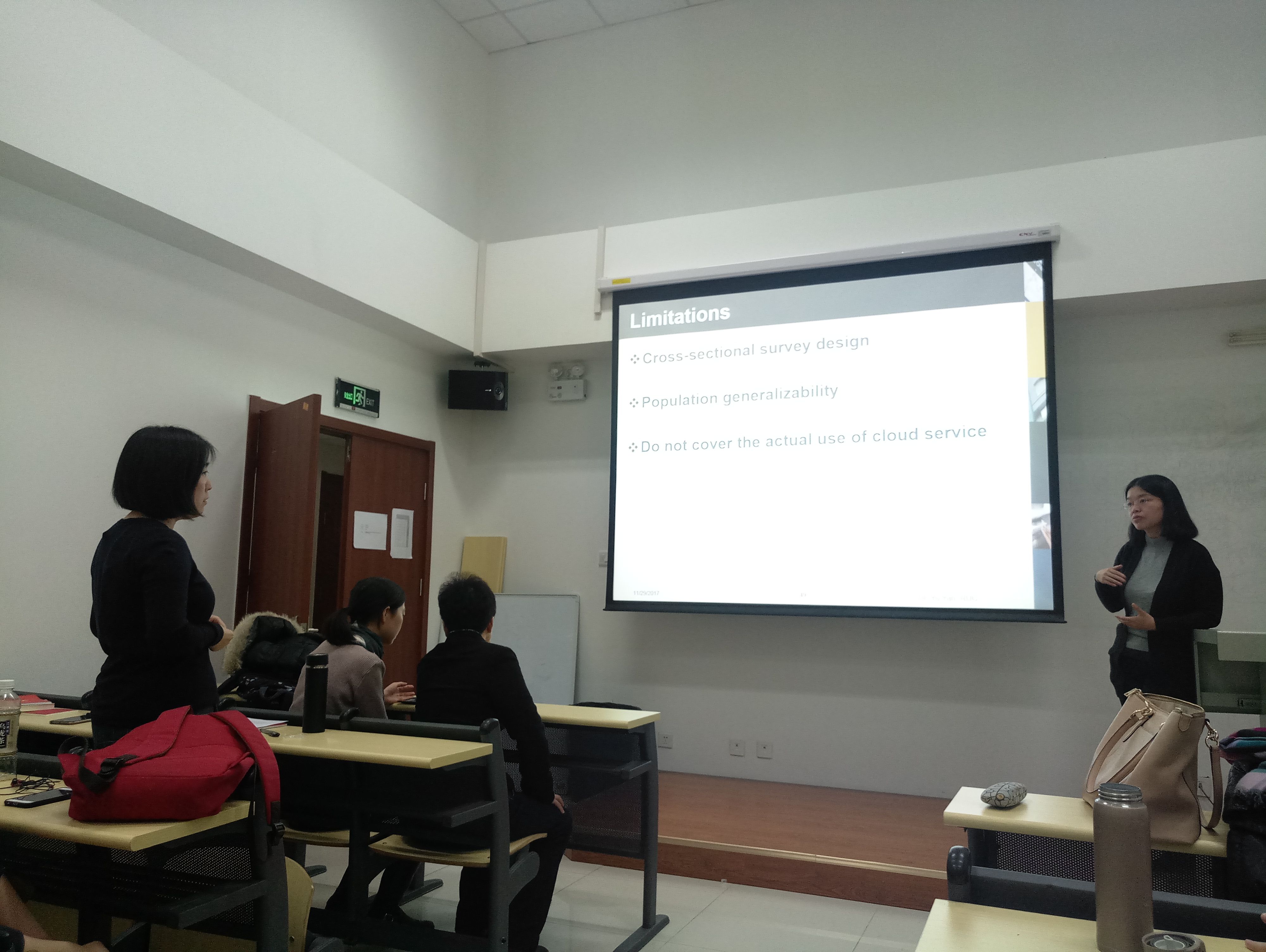 会议伊始,余老师概述了其近年来研究领域的进展。随后,余老师从研究动机、理论背景、研究假设、研究方法、启示及局限性六方面对其近期在国际期刊发表的文章作了详细介绍。同时,分享了在研究过程、投稿过程所遇困难及解决办法。