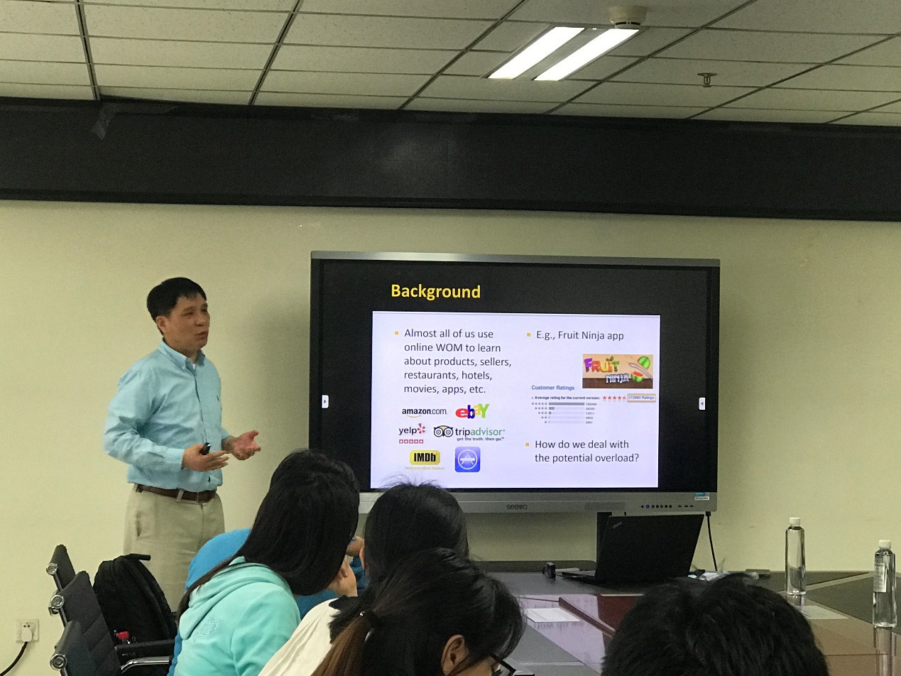 张教授就目前正在研究的课题Expressed Anger in Online Reviews: Not Helpful, But Persuasive。由于目前针对线上回复的研究较多,张教授选择线上回复的情绪角度为研究方向,重点研究了线上回复中的负面情绪。随后张教授重点介绍了愤怒是如何影响评论的读者,并且使用情绪理论和认知评价法作为研究的理论基础进行了四个研究,分别验证主效应与中介效应。通过张教授的详细介绍同学们对此研究有了详尽的了解,深受启迪和启发。论坛结束后,在场师生纷纷与张教授进行交流,现场互动气氛热烈,大家收获甚多。