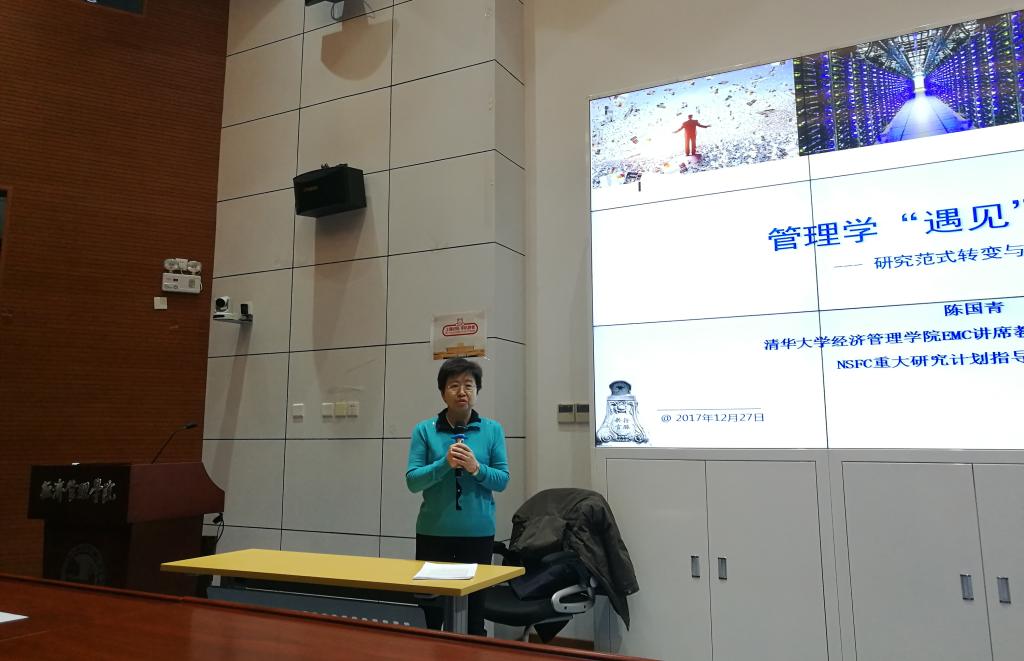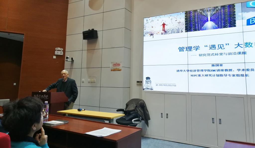 为增进学术交流、了解大数据时代的发展、交流国家级纵向科研项目申请的经验心得,2017年12月27日下午,冰球突破mg正规官网在北邮经管楼213多功能厅举办了名家学术讲坛第3期学术报告。本次学术活动邀请到清华大学冰球突破mg正规官网EMC讲席教授、学术委员会主任、NSFC重大研究计划指导专家组组长陈国青教授做题为“管理学‘遇见’大数据——研究范式转变与前沿课题”的主题报告。冰球突破mg正规官网院长王欢教授等二十余名中青年教师,全体博士研究生、部分硕士研究生、MBA在读学生以及有浓厚学术兴趣的本科各年级学生等100余名老师同学参加了本次论坛。闫强教授主持了本次论坛。