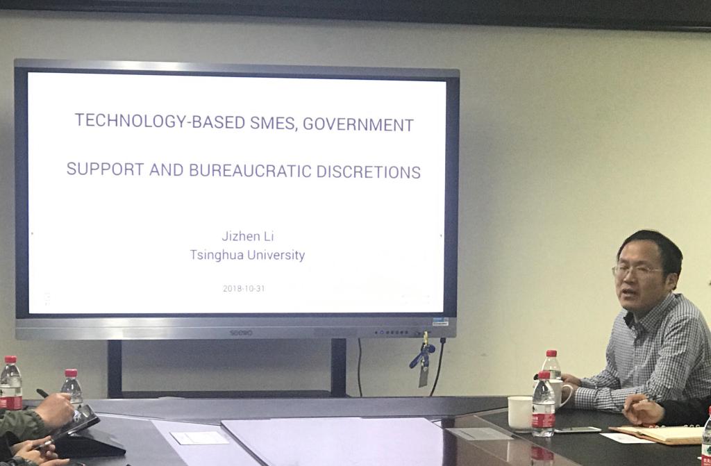 20181031日下午14:00,冰球突破mg正规官网在经管楼204举办了第26期青年学者学术论坛,邀请了清华大学冰球突破mg正规官网副院长、博士生导师李纪珍副教授做了题为《科技型中小企业的政府支持与行政裁量》的学术报告。参与本次论坛的有闫强副院长、学院中青年学者以及部分研究生代表。本次论坛旨在分享李纪珍老师最新的学术研究成果和研究心得。闫强副院长担任本次论坛主持人。