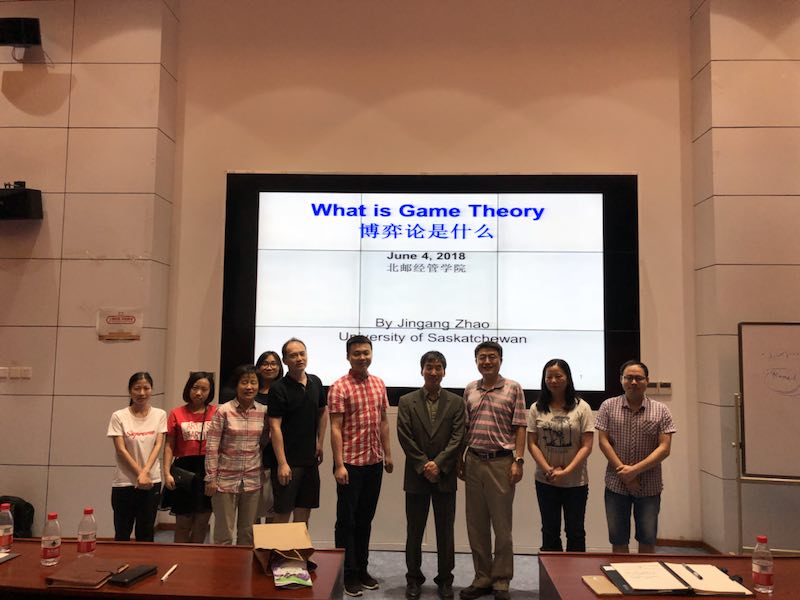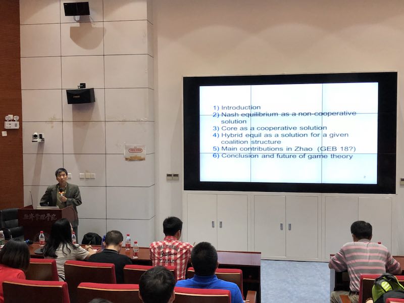 讲座伊始,赵进钢教授亲切地和大家介绍了加拿大的风土人情和学术状况,并介绍了自己的研究方向和专业考虑。之后赵进钢教授深入浅出地介绍了博弈论里的三种基本解,即纳什均衡、核、分和解。在此基础之上,赵教授结合刚被Games and Economic Behavior录用的期刊论文Three Little-known and yet still Significant Contributions of Lloyd Shapley讨论对博弈论的一些误解,并着重就非合作博弈论的问题展开论述。最后,赵教授也就博弈论的发展趋势以及在公共管理和经济领域的应用加以介绍。