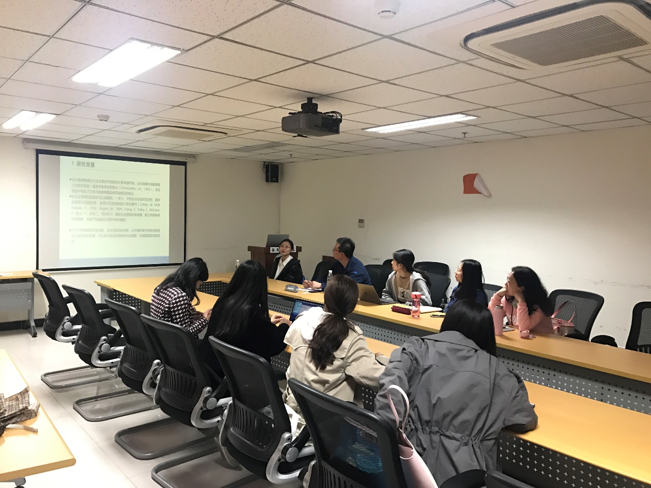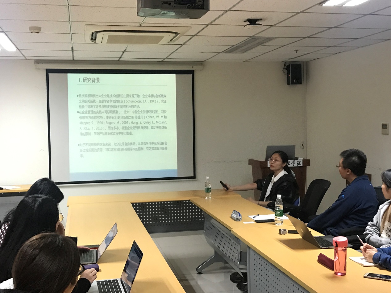李雅文老师向大家介绍了自己的研究内容“企业规模如何影响创新效率—以中关村示范区企业为例”。该研究探讨了企业规模与企业创新效率之间的差异,以及哪些因素会造成这种差异。具体通过对企业知识生产过程和知识商业化过程分别展开讨论,分析了企业规模的作用机制和企业效率的影响因素,对组织惯性理论、资源基础理论和企业联盟研究、产业集群研究都做出了理论贡献,并对企业开展技术并购活动、选择正确的联盟伙伴、选择合适的园区以实现其知识生产和知识商业化效率的提升提供了实践指导。介绍研究内容的同时李老师还为大家讲述了自己在科研过程中的心得体会,对研究选取等方面提出了一些建议。