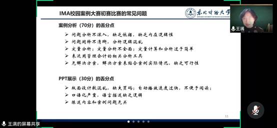 最后,王满教授强调,参赛同学在制作PPT时,其一要避免版面设计混乱、缺失页码、自动播放速度过快等问题;其二注意语言描述要有专业性、精确性和逻辑性,不可连篇累牍;其三注意陈述内容要和案例问题紧密相关。