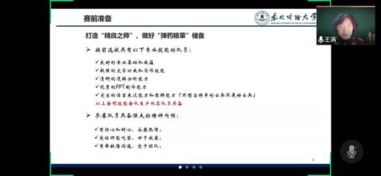 首先,王满教授认为打造“精良之师”的前提是要做好“弹药粮草”储备。王老师认为参赛同学应具有良好的专业基础和底蕴,掌握较强的文字功底和写作技能,具备清晰的逻辑分析能力、优秀的PPT制作能力和突出的语言表达能力和思辨能力。与此同时,王老师认为,参赛队员应该具备强大的精神内核:一方面要有恒心和耐心,永葆热情;另一方面要爱钻研能吃苦,甘于寂寞。
