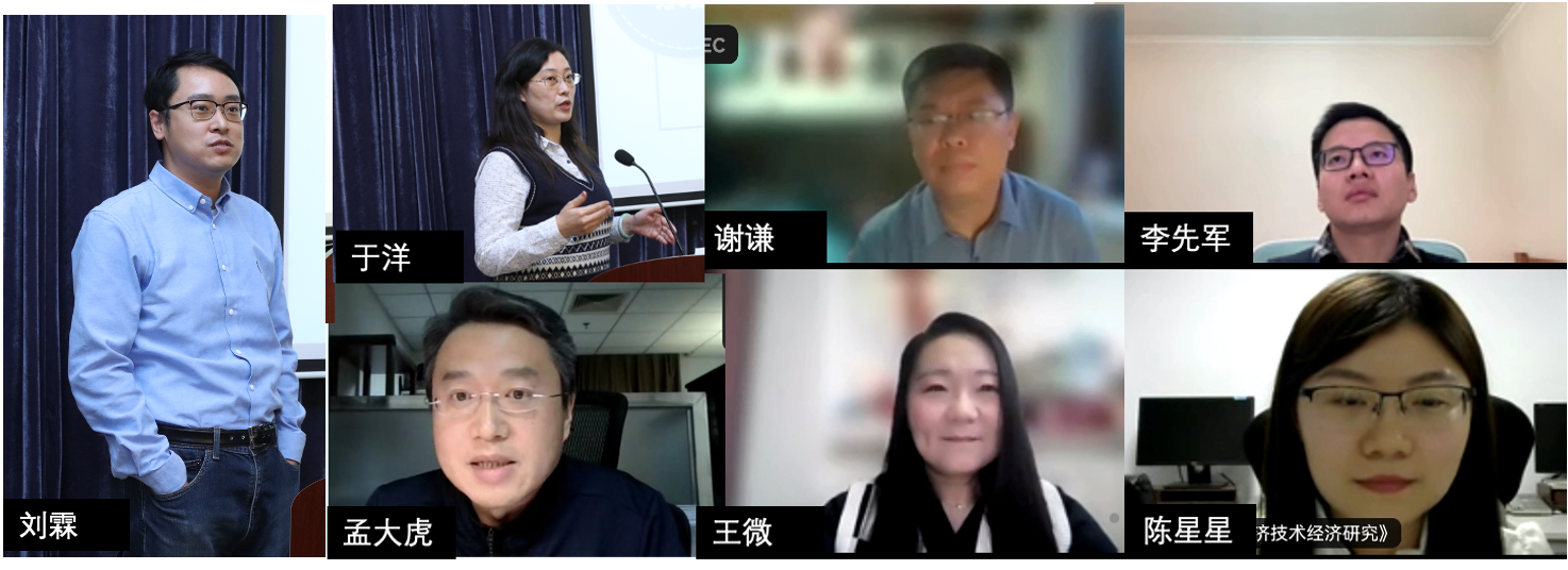 (从左至右:Journal of Digital Economy《数字经济》副主编刘霖教授、《统计研究》编辑部负责人于洋老师、《经济研究》编辑部副主任谢谦研究员、中国社会科学院工业经济研究所李先军副研究员、《北京师范大学学报(社会科学版)》编辑部孟大虎主任、《世界经济》王徽老师、《数量经济技术经济研究》编辑部陈星星副主任)