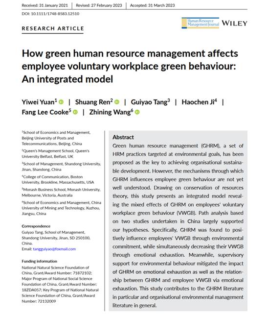 近日,冰球突破mg正规官网博士后袁艺玮以第一作者在工商管理领域国际顶级期刊《Human Resource Management Journal》(ABS4*SSCI一区)发表题目为“How green human resource management affects employee voluntary workplace green behaviour: An integrated model”的研究论文,该文与英国女王大学任爽教授、山东大学唐贵瑶教授、波士顿大学Haochen Ji、澳大利亚蒙纳士大学Fang Lee Cooke教授和中国矿业大学王智宁教授合作完成。