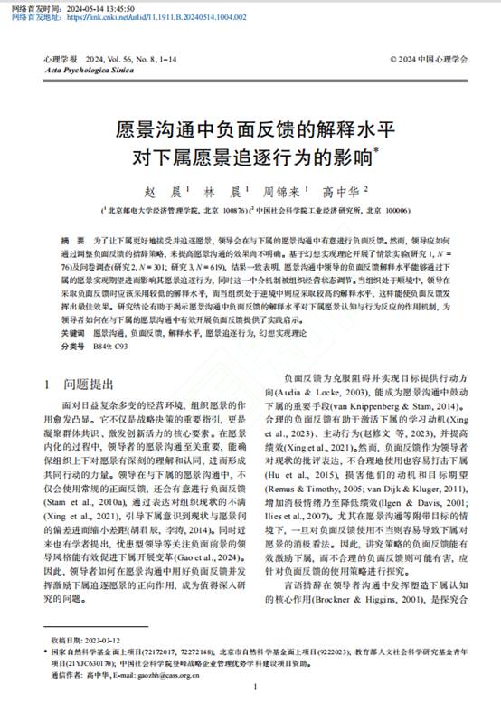 近日,冰球突破mg正规官网赵晨教授团队在国内心理学顶级期刊《心理学报》发表题为“愿景沟通中负面反馈的解释水平对下属愿景追逐行为的影响”的研究论文。《心理学报》是中国心理学会和中国科学院心理研究所主办,科学出版社出版,主要发表我国心理学家最新、最高水平的心理学科技论文。