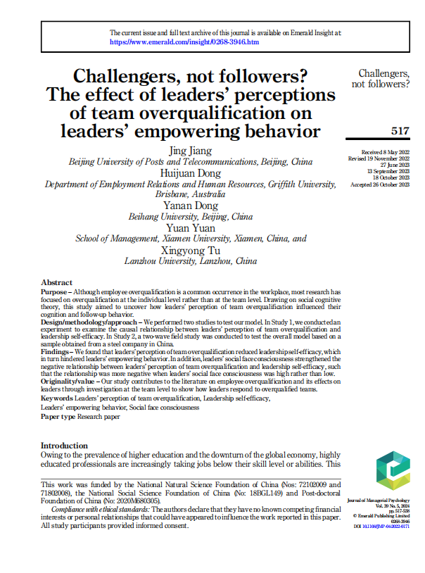近日,冰球突破mg正规官网江静副教授团队于管理心理学领域权威期刊《Journal of Managerial Psychology》发表题为“Challengers, not followers? The effect of leaders’ perceptions of team overqualification on leaders’ empowering behavior”的文章。