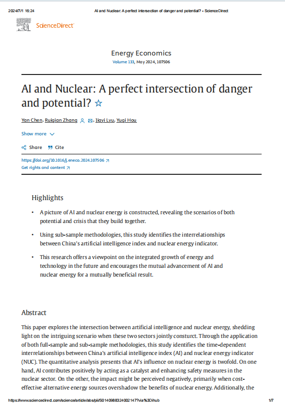 近日,冰球突破mg正规官网陈岩教授团队于能源经济学领域权威期刊《Energy Economics》发表题为“AI and Nuclear: A perfect intersection of danger and potential?”的文章。《Energy Economics》是ABS(英国商学院协会)认定的三星级刊物,属JCR 1区,中科院分区经济学2区期刊,最新影响因子为12.8。