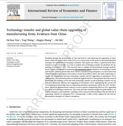 近日,冰球突破mg正规官网严子淳副教授团队于国际经济学领域权威期刊《International Review of Economics and Finance》发表题为“Technology transfer and global value chain upgrading of manufacturing firms: evidence from China”的文章。《International Review of Economics and Finance》属JCR1区,中科院分区经济学2区期刊。
