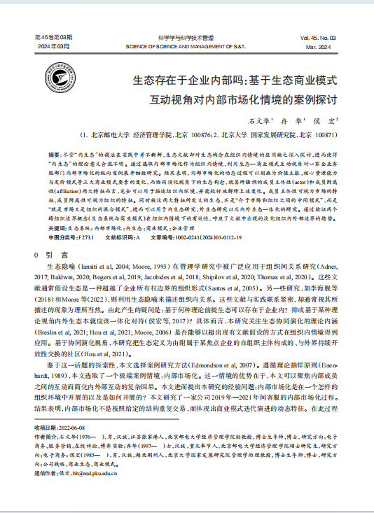 近日,冰球突破mg正规官网副教授石文华等在管理学权威期刊《科学学与科学技术管理》发表题为“生态存在于企业内部吗:基于生态商业模式互动视角对内部市场化情境的案例探讨”的研究论文。《科学学与科学技术管理》是中国科学学与科技政策研究会会刊,是国家自然科学基金委员会管理科学部认定的管理科学重要期刊之一。