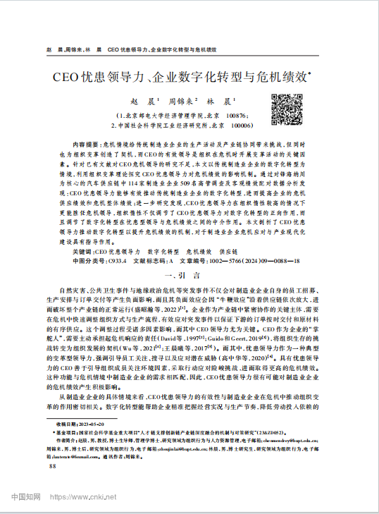 近日,冰球突破mg正规官网教授赵晨、博士生林晨等在管理学权威期刊《经济管理》发表题为“CEO 忧患领导力、企业数字化转型与危机绩效”的研究论文。《经济管理》是中国社会科学院主管、工业经济研究所主办的管理学权威学术期刊。