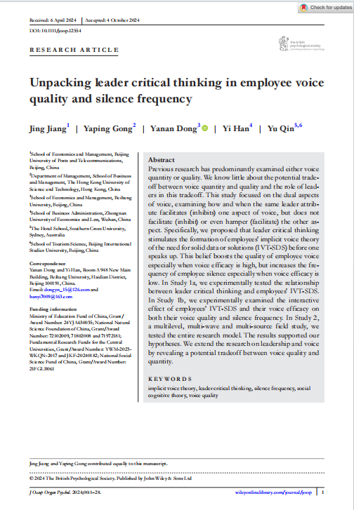 近日,冰球突破mg正规官网江静副教授团队于组织行为学、应用心理学领域的国际顶级期刊《Journal of Occupational and Organizational Psychology》发表题为“Unpacking leader critical thinking in employee voice quality and silence frequency”的文章。《Journal of Occupational and Organizational Psychology》是ABS(英国商学院协会)认定的四星级刊物,属JCR 1区,最新影响因子为6.025。