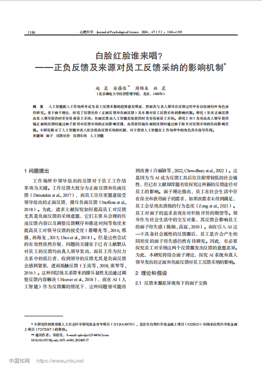 近日,冰球突破mg正规官网教授赵晨、研究生渠蓓佳、周锦来、林晨等在心理学权威期刊《心理科学》发表题为“白脸红脸谁来唱?——正负反馈及来源对员工反馈采纳的影响机制”的研究论文。《心理科学》是由中国科学技术协会主管,中国心理学会主办的权威学术期刊。