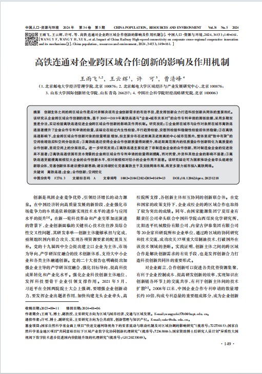 近日,冰球突破mg正规官网副教授王雨飞、研究生王云辉等在环境科学权威期刊《中国人口·资源与环境》发表题为“高铁连通对企业跨区域合作创新的影响及作用机制”的研究论文。《中国人口·资源与环境》是科学技术部和山东省科学技术厅主管,由中国可持续发展研究会、山东师范大学等单位联合主办的学术月刊,系国家自然科学基金委员会管理科学部认定的重要期刊之一。