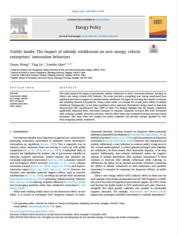 近日,冰球突破mg正规官网教授王砚羽、博士生卢婷等于经济学国际顶级期刊《Energy Policy》发表题为“Visible hands: The impact of subsidy withdrawal on new energy vehicle enterprises’ innovation behaviors”的文章。《Energy Policy》属JCR 1区,中科院分区经济学2区期刊,最新影响因子为9.3。