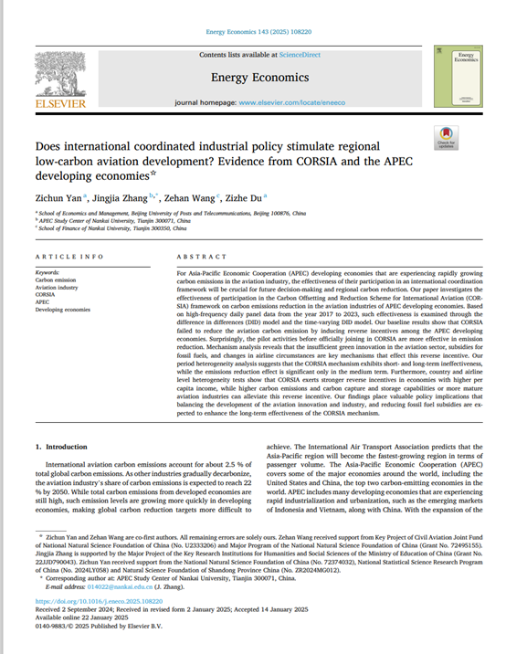 冰球突破mg正规官网严子淳副教授开展的最新研究成果发表于ABS三星JCR一区期刊《Energy Economics》。研究基于 2017 至 2023 年的高频日面板数据,运用双重差分(DID)及时变DID模型,对国际航空碳抵消和减排计划(CORSIA)在APEC发展中经济体航空碳排放方面的影响进行了深入剖析。