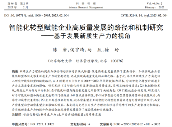 2025年2月,冰球突破mg正规官网教授陈岩等在管理学权威期刊《科研管理》发表题为“智能化转型赋能企业高质量发展的路径和机制研究——基于发展新质生产力的视角”的论文。《科研管理》是国家自然科学基金委员会管理科学部认定的管理科学A级重要期刊。