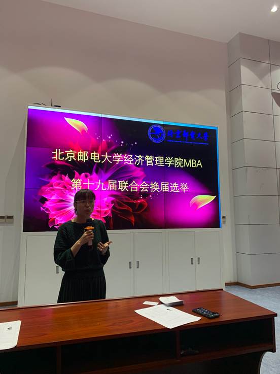 最后,MBA中心主任唐菊华老师做大会总结发言。她对同学们积极服务的态度和对学院的大力支持表示感谢,对第18届联合会的贡献表示肯定,也表达了对新一届联合会的殷切期许。希望我们充分利用好学院的各类资源,积极参加各项活动,和校友会形成良好的互动。唐老师表示学院和校友会会是我们坚强的后盾,她希望北邮MBA能够像一个大家庭一样和谐相处,其乐融融,也期待新一届MBA联合会能够团结一致,助力MBA项目办得越来越好。