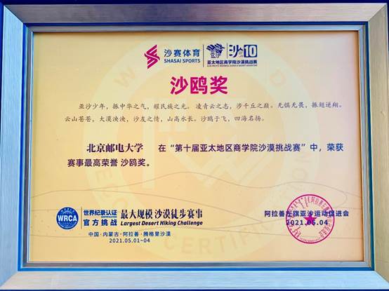 2021年5月2日-5月4日,历时3天2夜的沙10挑战赛(第十届亚太地区商学院沙漠挑战赛)在内蒙古阿拉善盟左旗腾格里沙漠圆满完赛,北邮沙10 Saucony战队勇夺亚沙最高奖项金沙鸥,取得了北京赛区前3,全国前15的好成绩。34位队员120天的刻苦训练,3天70km安全完赛,他们赢了自己,交上了完美的答卷。
