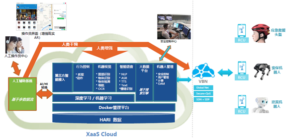 所谓云端机器人,即HARI+MCS+RCU+Robot Body,云端智能机器人由以下部分组成:位于XaaS Cloud之上的云端大脑基于HARI架构(Human Augmented Robotic Intelligence),为智能设备与机器人提供了融合智能(AI+HI) ,包括智能视觉,自然语言处理和其他人工智能API;移动内联网MCS架构为云端智能机器人提供了端到端的安全;RCU(Robot Control Unit)是服务机器人的控制器,用于连接机器人身体与安全的网络神经VBN(Virtual Backbone Network)网络,并使用云端大脑上的智能。根据王德双校友介绍,当前的人工智能技术还不能达到理想的境界,在现阶段有人类增强的服务会更适合真实的应用场景,对此,达闼提出了特有的人类辅助的解决方案,详细可见下图:
