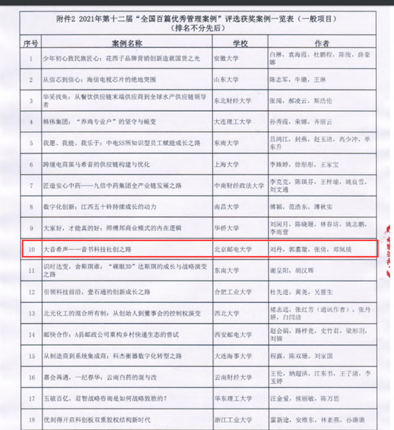 2021年8月30-31日,由全国工商管理专业学位研究生教育指导委员会主办、中国管理案例共享中心负责组织的第十二届“全国百篇优秀管理案例”专家评审会在常熟召开。我院刘丹老师指导编写的案例《大音希声-音书科技社创之路》荣获全国MBA教指委举办的第十二届“全国百篇优秀管理案例”。 这也是十二届来北邮经管院案例继去年来第二次获此殊荣。