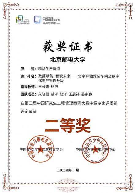 本届大赛初赛阶段共收到来自187家研究生培养单位的优秀案例572个,经专家匿名评审,共有 72 支案例队伍脱颖而出,成功晋级决赛。我院MEM共有五支队伍报名参赛,其中由2023级MEM“工管侠客行”代表队提交的“数据赋能,智驭未来——北京奔驰焊装车间全数字化生产管理升级”案例成功闯进决赛,通过现场的激烈角逐,最终位列“精益生产赛道”第四名并荣获二等奖,打破我院往届参赛记录。