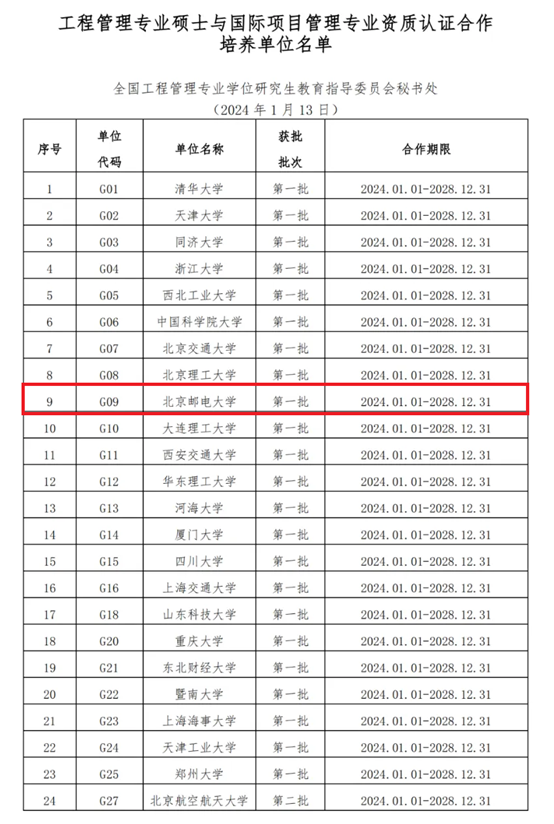 2024 年 1 月 13 日,冰球突破mg正规官网工程管理硕士(MEM)顺利通过《第一、二批工程管理硕士与国际项目管理专业资质认证(IPMP)合作培养单位评估》,并获得续约,合作期限为2024年1月1日至2028年12月31日。