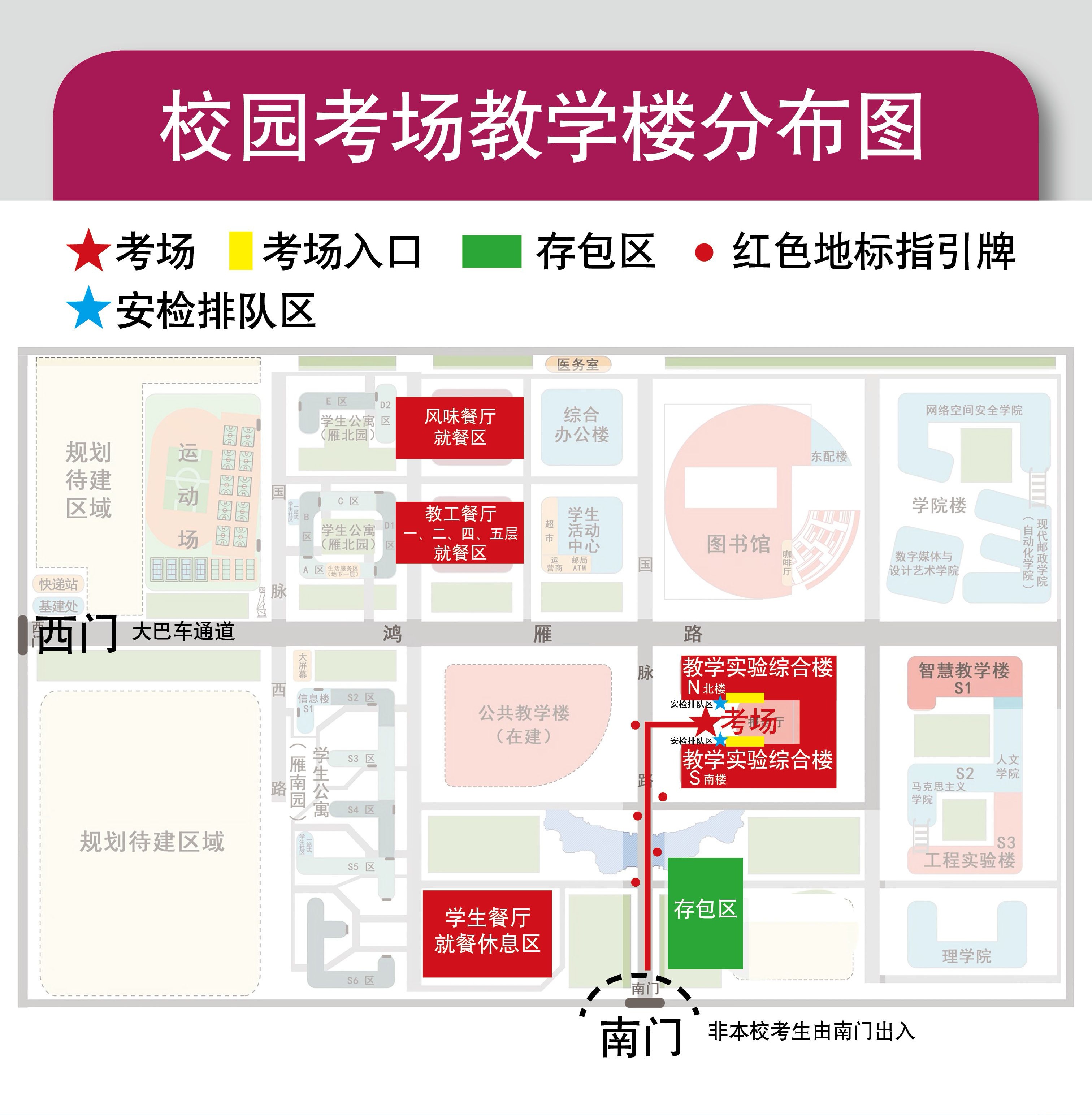 考试期间两校区均不允许校外车辆(含出租车)进入校园,建议考生勿自驾前往。
