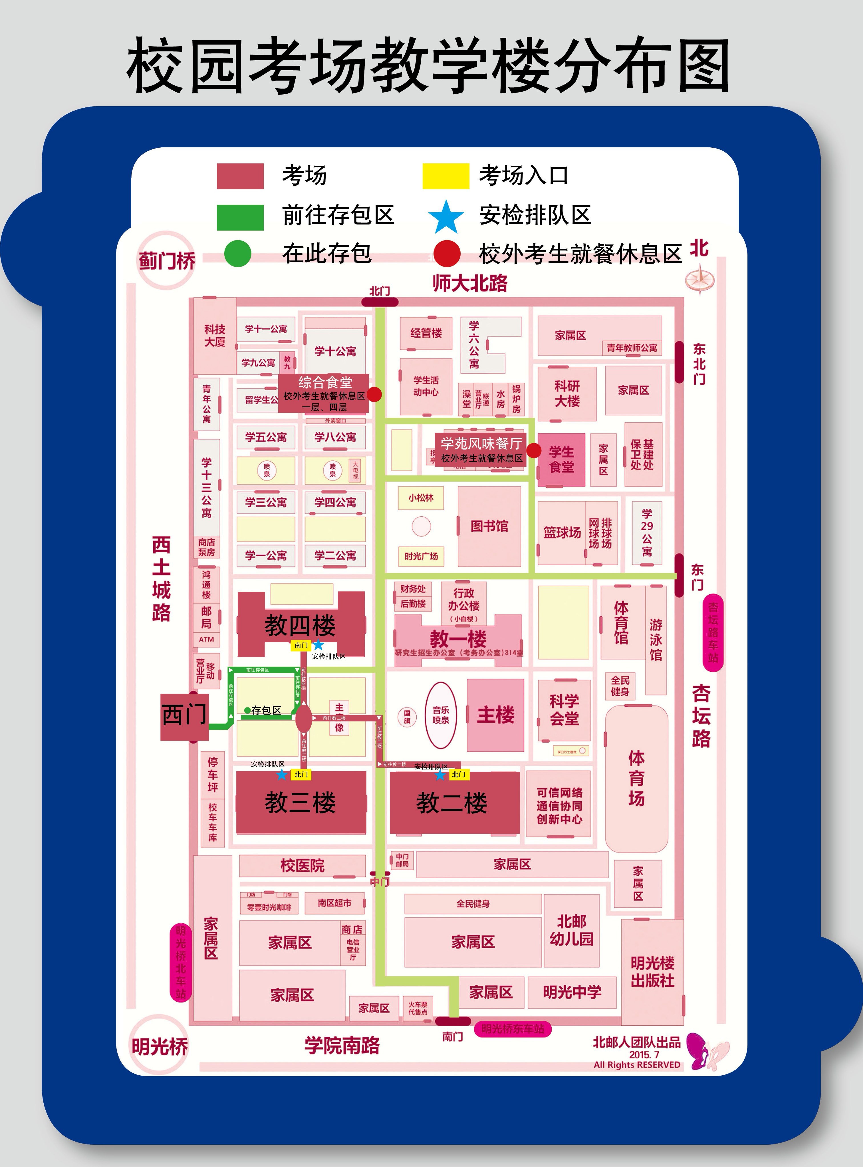 考试当天7:00开始允许考生进入校园,请考生由西土城(海淀)校区西门、沙河(昌平)校区南门进校。