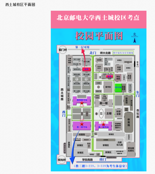 西土城校区:教二楼、教三楼、教四楼为本次考试的考场。考试期间,教二楼北门、教三楼北门、教四楼南门为考生的出入口。