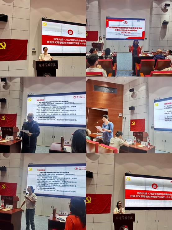 接着,晏梦灵老师带领全体党员同志共读《习近平新时代中国特色社会主义思想的世界观和方法论》并分享感悟。晏梦灵老师首先对习近平新时代中国特色社会主义思想的世界观和方法论进行了深入浅出地解读,引导大家从多个维度深入理解和领会这一理论成果。全体党员同志认真阅读了相关文献材料。朱子丹、魏依宁、莫远洪、廉鑫蕊等党员同志以青年视角分享感悟,体现了青年党员的自信自立。全体党员同志深刻认识到习近平新时代中国特色社会主义思想的伟大意义和理论价值,更加清晰地认识到自己的政治责任和历史使命。大家一致赞同和支持这一理论成果,并表示将在今后的工作实践中更加自觉地贯彻落实习近平新时代中国特色社会主义思想和党的二十大精神,为实现中华民族伟大复兴的中国梦作出积极贡献。