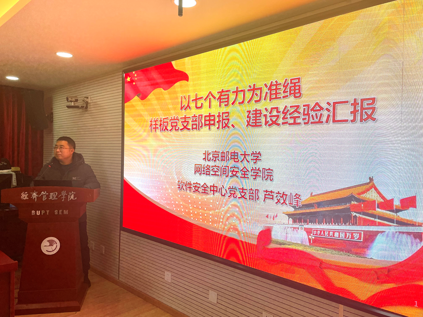 党支部书记芦效峰老师围绕教育党员有力、管理党员有力、监督党员有力、组织师生有力、凝聚师生有力、宣传师生有力7个方面,结合软件安全中心工作和学科特点,全方位分享了全国党建工作样板支部的建设经验,展示了以科研态度钻研党建工作、党建业务融合凝练特色工作的支部工作特色。