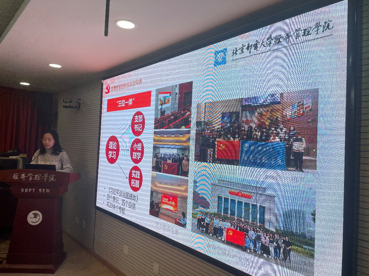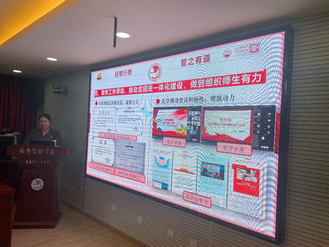 党支部书记冯天晴以“讲青年故事,育时代新风”为题,从育理想坚定的忠实信仰者、争挺膺担当的榜样示范者、当砥志研思的学术攀登者、建强国有我的积极实践者等四个方面,紧密结合学生学习、服务师生等方面分享了开展党支部工作的显著成效。