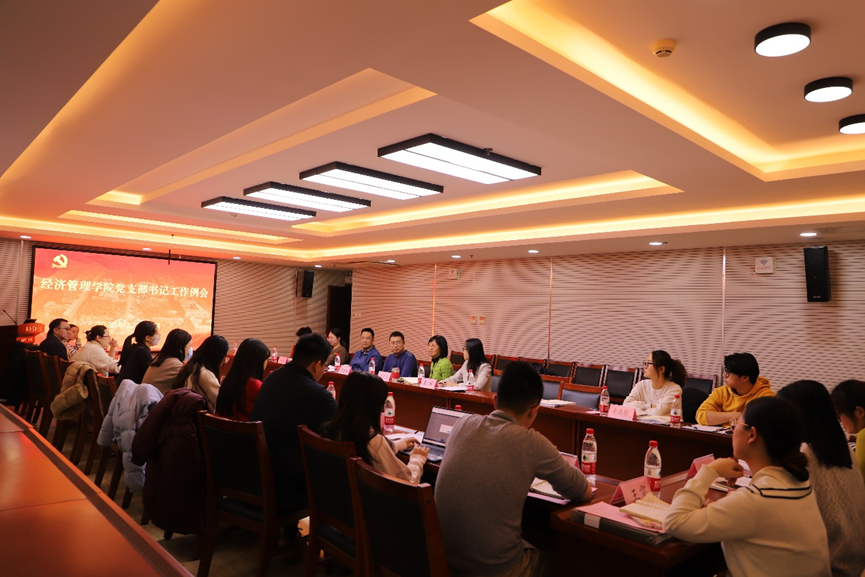 2023年12月13日下午,冰球突破mg正规官网党委在经管楼202会议室召开了“党支部标准化规范化建设”专题工作会,会议传达了学校党委《党建工作十条》《思政工作十条》文件精神,根据学校相关通知精神部署了学院党建相关重点工作,学习了全国党建工作样板支部、学校党建工作样板党支部、学校研究生样板党支部的建设经验,师生党支部书记就近期工作梳理及后期工作进行了汇报。学院党委书记王宏原、院党委副书记宋娟、组织员陈伟、党务干事康晓萌、师生党支部书记参加会议。会议由院党委书记王宏原主持。