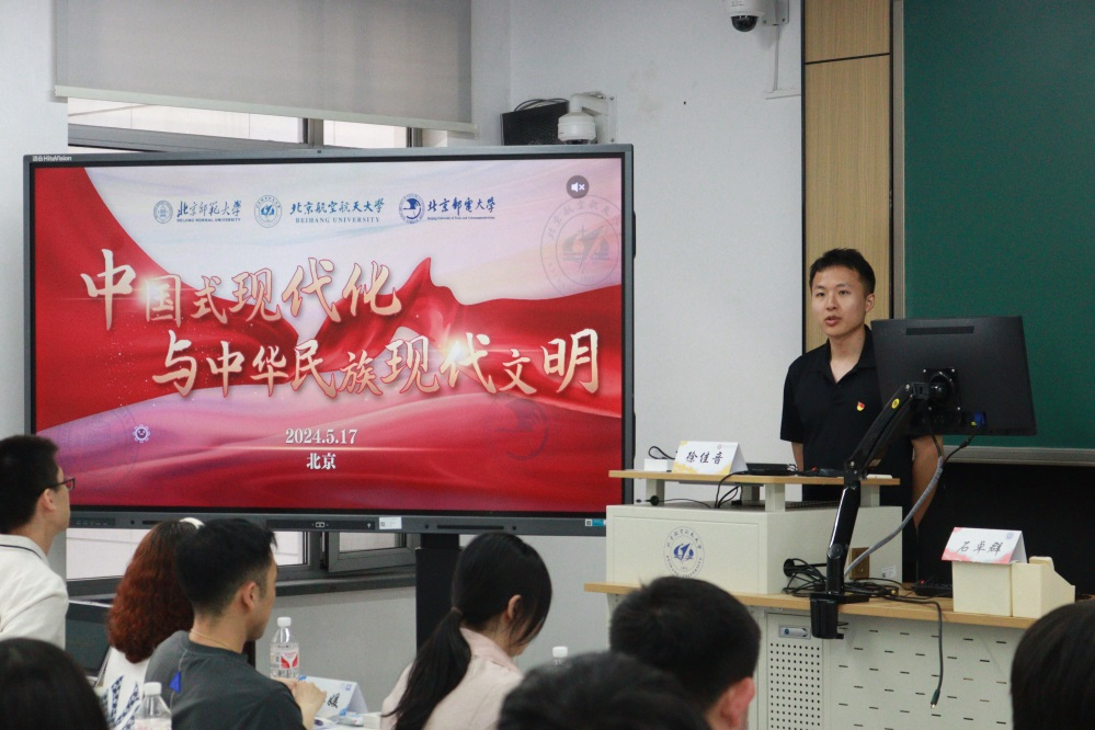 参观结束后,各党员移步至北京航空航天大学会议室,开展了以“中国式现代化与建设中华民族现代文明”为主题的理论交流学习。北邮经管院学工办主任安思颖老师在开场时发言表达了对三个支部同志的感谢,并期望未来可以继续深化三个支部之间的合作与交流,共同推动党建工作的创新与发展。与会党员认真听讲,积极思考,对中国式现代化有了更为深刻的认识。