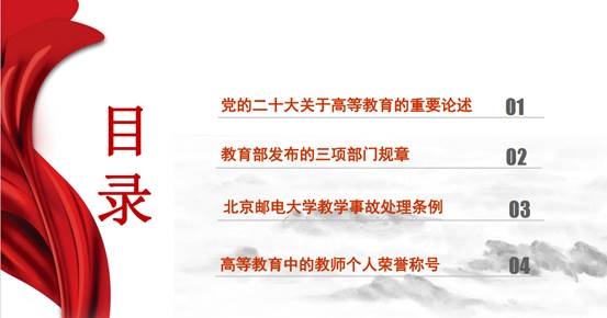支部书记晏梦灵首先重温了党的二十大报告中关于高等教育的重要论述。报告第五部分专章阐述教科工作,把教科工作摆在了更为突出的位置:实施科教兴国战略,强化现代化建设人才支撑。这些论述支撑了高等教育师德师风建设的紧迫性和重要性。随后她解读了教育部发布的三项部门规章,分别是2011年12月印发的《高等学校教师职业道德规范》、2014年9月印发的《教育部关于建立健全高校师德建设长效机制的意见》和2018年11月印发的《新时代高校教师职业行为十项准则》,并根据2018年11月发布的《教育部关于高校教师师德失范行为处理的指导意见》对违反上述三项规定的师德失范行为后果进行了解读。最后,她结合冰球突破mg正规官网发布的《冰球突破mg正规官网师德集中学习教育实施方案》《冰球突破mg正规官网教学事故处理条例》和冰球突破mg正规官网评选的各类教师个人荣誉称号对学校层面的奖惩措施和师德师风建设行动方案进行了简要介绍。
