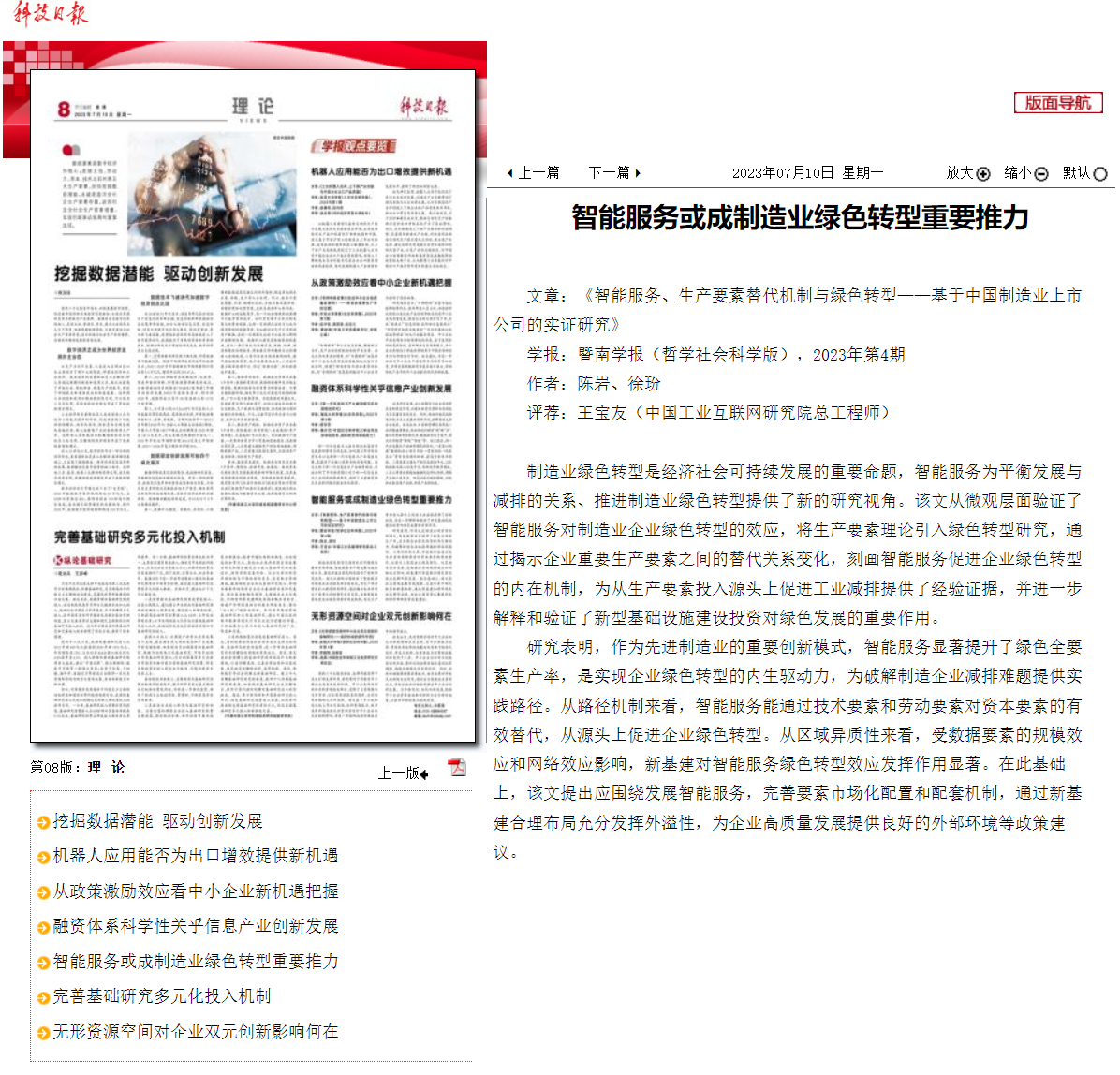 2023年7月10日,《科技日报》“学报观点要览”栏目刊发文章《智能服务或成制造业绿色转型重要推力》推荐冰球突破mg正规官网陈岩教授的学术论文。陈岩教授论文原文题目《智能服务、生产要素替代机制与绿色转型——基于中国制造业上市公司的实证研究》,发表于暨南学报(哲学社会科学版),2023年第4期。