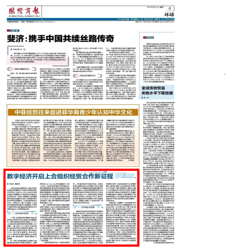 2023年8月7日,商务部官方报纸《国际商报》,刊发我院李宏兵教授评论文章《数字经济开启上合组织经贸合作新征程》。